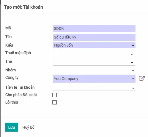 Chi tiết tạo tài khoản thực hiện tương tự hướng dẫn tạo tài khoản tại bài viết: https://www.erponline.vn/docs/13.0/d/thiet-lap-co-ban-de-su-dung-hieu-qua-odoo-ke-toan-546?